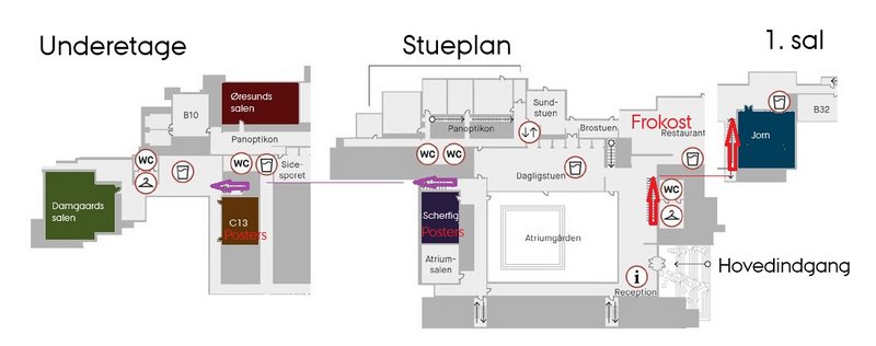 The Marine Science Meeting will take place at the Konventum conference center in Helsingør. Konventum is the largest conference center in North Zealand, situated in scenic surroundings. The Marine Science Meeting will be held in the two auditoriums, Jorn and Damgaardssalen, with streaming between them during plenary sessions. In addition, there will be parallel sessions in Øresundssalen (Tuesday and Wednesday), as well as in Scherfig and C13 (Thursday). Posters will be presented in two sessions, on Tuesday and Wednesday respectively, in Scherfig and C13.
