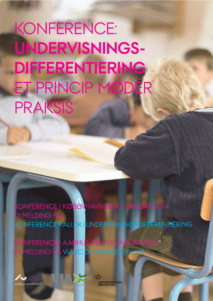 Konferencen "Undervisningsdifferentiering – Et princip møder praksis" afholdes af Institut for Uddannelse og Pædagogik (DPU), Aarhus Universitet i samarbejde med professionshøjskolerne UCC, VIA UC & UC SYD samt Undervisningsministeriet, idet udgangspunktet er det fælles forsknings- og udviklingsprojekt ’Eksemplariske undervisningsforløb i dansk og matematik med fokus på undervisningsdifferentiering og elever med særlige behov’. Målet med projektet har været begrebsligt at afklare forskellige former for undervisningsdifferentiering samt at udvikle didaktiske designs, som kan afprøves, beskrives, analyseres og evalueres som eksempler på god praksis i forhold til undervis-ningsdifferentiering rettet mod elever i komplicerede læringssituationer. Det er projektets resultater, som præsenteres på denne konference både i plenum og i workshops.
